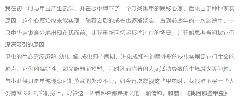 这类文字往往将摄影与情感的关系处理得太直线:我有记忆→我拍下来→所以这是作品。但你拍的是什么?你如何处理童年的转喻?你是拍甲虫,还是拍一种被观看的符号?你如何避免重复现成的自然观?这些都没有,只留下情怀,没有观点。