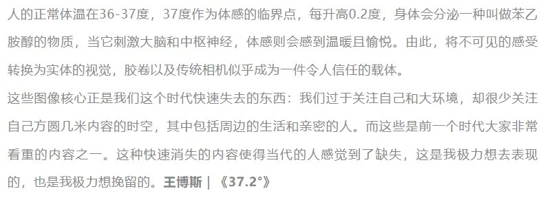 《37.2°》以苯乙胺醇与体温作为导语,语言像是摄影神经科学的包装设计。它试图构建一种生理感受与视觉信任的关联,但实际效果更像是为老派胶片情怀披上理性外衣。这不是观看的策略,而是一种糖衣叙事。冷知识的添加,只是让语气显得不那么感伤,却依然说不准、疼不到点。