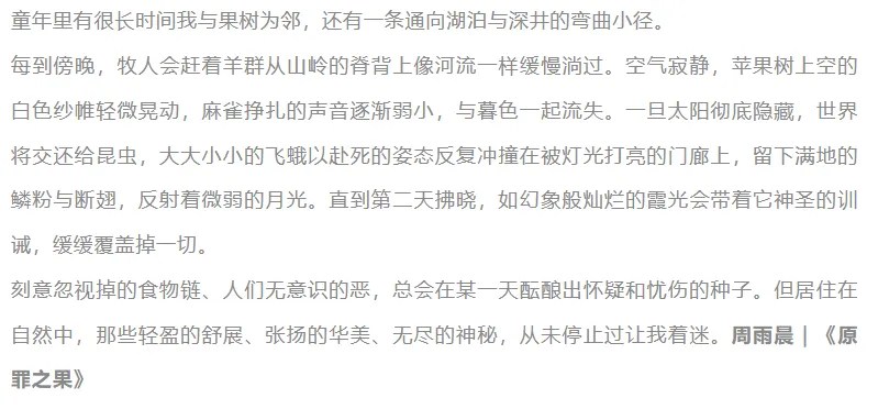 《原罪之果》的语言细腻、飘逸,像微型散文诗。它写得太准确了,准确得让人怀疑文字是否先于影像而诞生。每个形容词都像设计好的意象道具,它谈自然、罪、记忆、消逝,却没有任何一句话让人感觉作者曾真正面对过观看的挑战。这不是现场,是排练场。