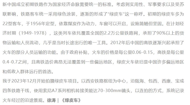 《绿皮车》的自述则是理工男式的叙事:列出年份、线路、镜头焦段,一副很踏实的样子。但你说你连拍,那你拍的是什么?运动中的模糊?车窗的节奏?还是纪实速度与观看方式的交错?你拍的是物件,不是观看。这不是观看叙事,而是摄影等于设备的假象。