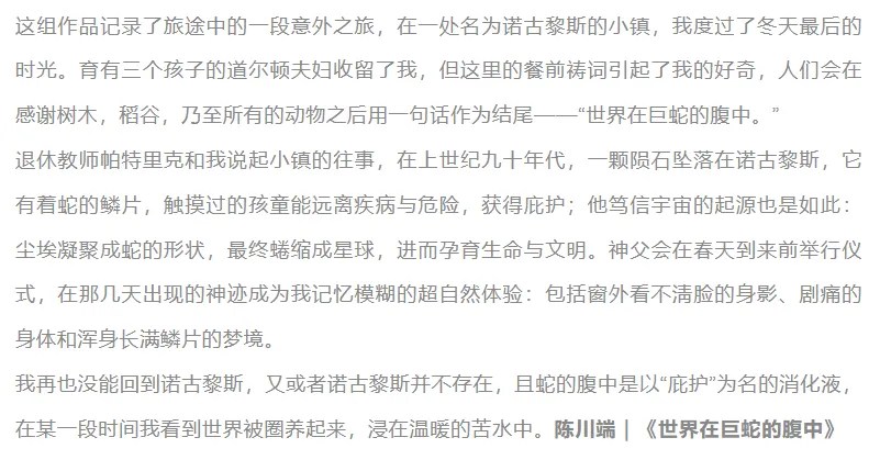 语言最讲究的,是《世界在巨蛇的腹中》。整段文字像一座小型文本装置,节奏克制、修辞完整、语调神秘、结构暧昧。它从餐前祷词绕进地理、梦境、陨石与神话。但这种语言的整洁与设计感,让观看的位置被封住。它像一段文学,却缺乏文学应有的风险;像艺术家语言,却不带艺术家的颤抖。观者无处可插,语言成了墙,不是入口。